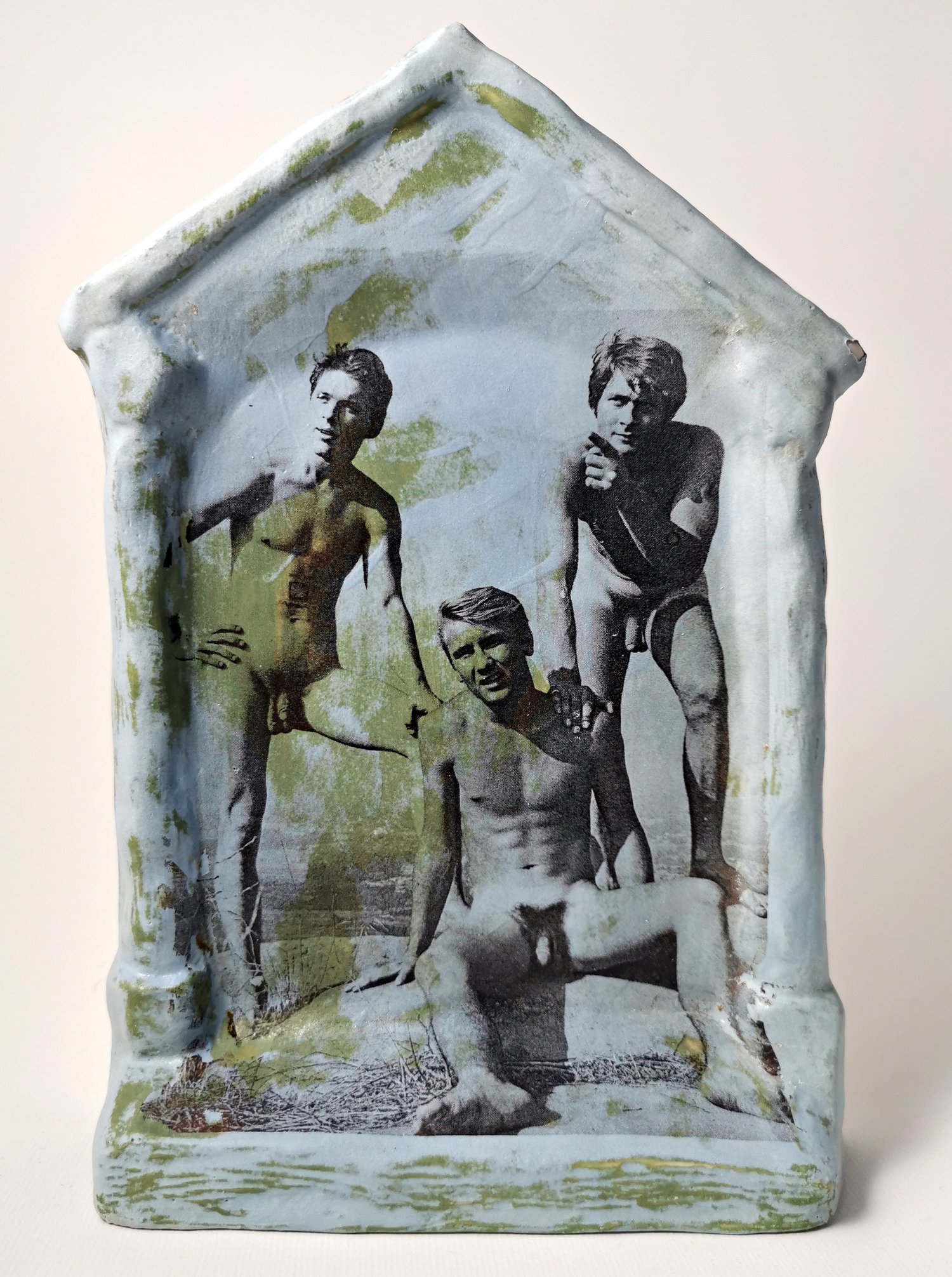 Handmade glazed porcelain altar, iron oxide photo transfer and ceramic decals.